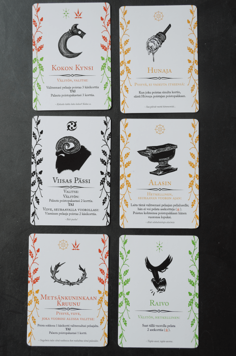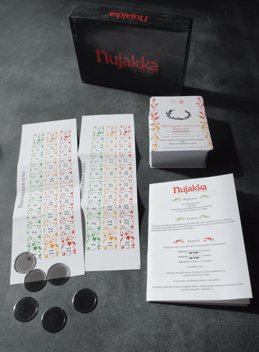 This is my card game Nujakka in a basically finished stage. I ordered 10 of them from America and I’m super pleased with the outcome. We already had a match with the game, and it’s playing great. Obviously, when I’m going to manufacturing I’ll address any new issues or fixes that rise up in the tests even at this stage. Some card texts might need tuning or additional things added to the rulebook, but these images are maybe 90% of what Nujakka will look like when it’s complete. I’m hoping that the approximate 15x10x3 cm dimensions will be kept when producing the game, the game box is a great fit for even the most hardcore collector’s shelf!